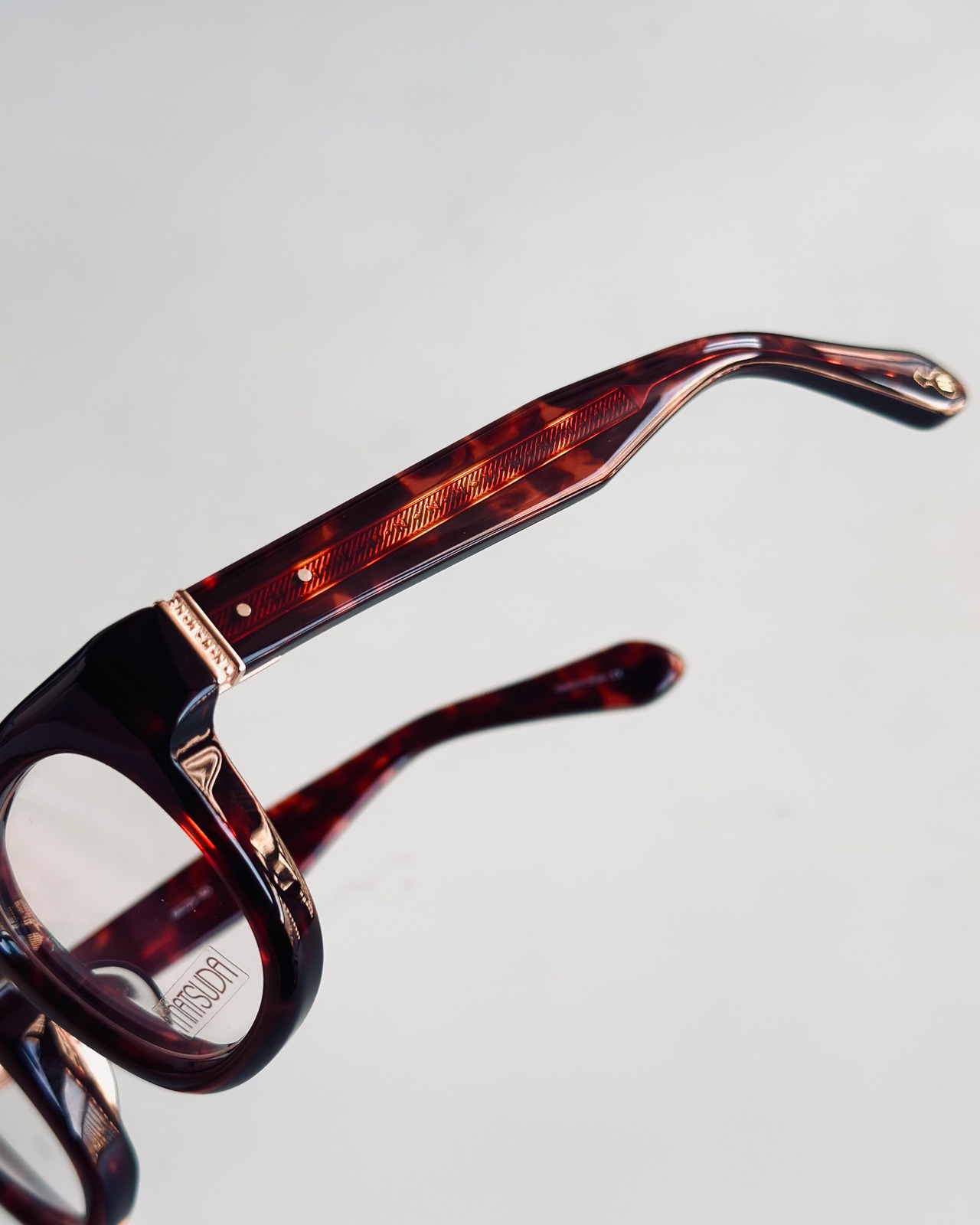 10mm厚のアセテートに”MATSUDA”の定番の彫金の芯を差し込み、